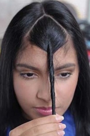 Ao contrário do que muitas meninas fazem, a divisão do cabelo na parte de cima do cabelo tem que ser de um triângulo como na foto abaixo, e não reto.
