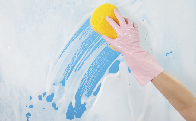 Passe no Box, deixe agir por 5 minutos, esfregue com esponja do lado macio e enxágue bem. Seque o box.