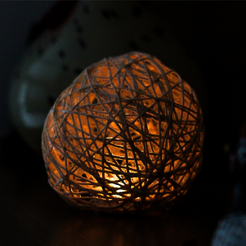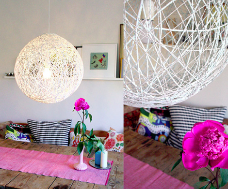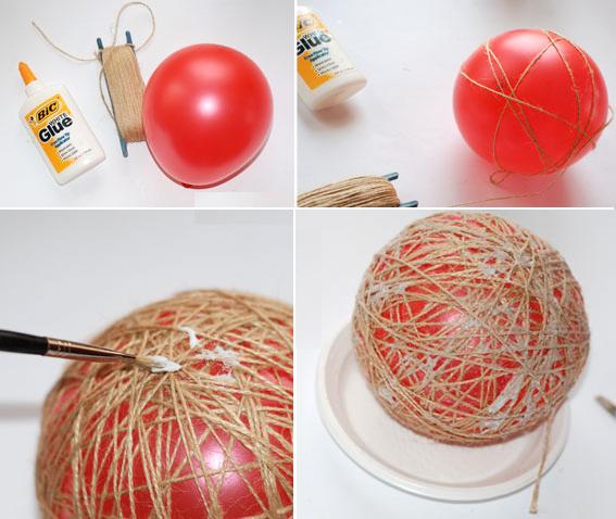 Primeiro, encha a bexiga até o tamanho ideal para a luminária que você deseja construir. Depois derrame a cola em algum pote e misture o barbante. Amarre a bexiga, e comece a cobri-la com a mistura de barbante e cola. Quando estiver seco basta estourar a bexiga e tirar a sobra de dentro da luminária, o resultado fica muito legal.