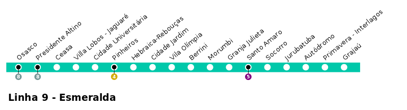 A linha 9 estende-se por 32,8 quilômetros passando por dezoito estações. Faz a ligação da região sul do município de São Paulo com o município de Osasco, percorrendo quase toda a extensão da marginal do rio Pinheiros.