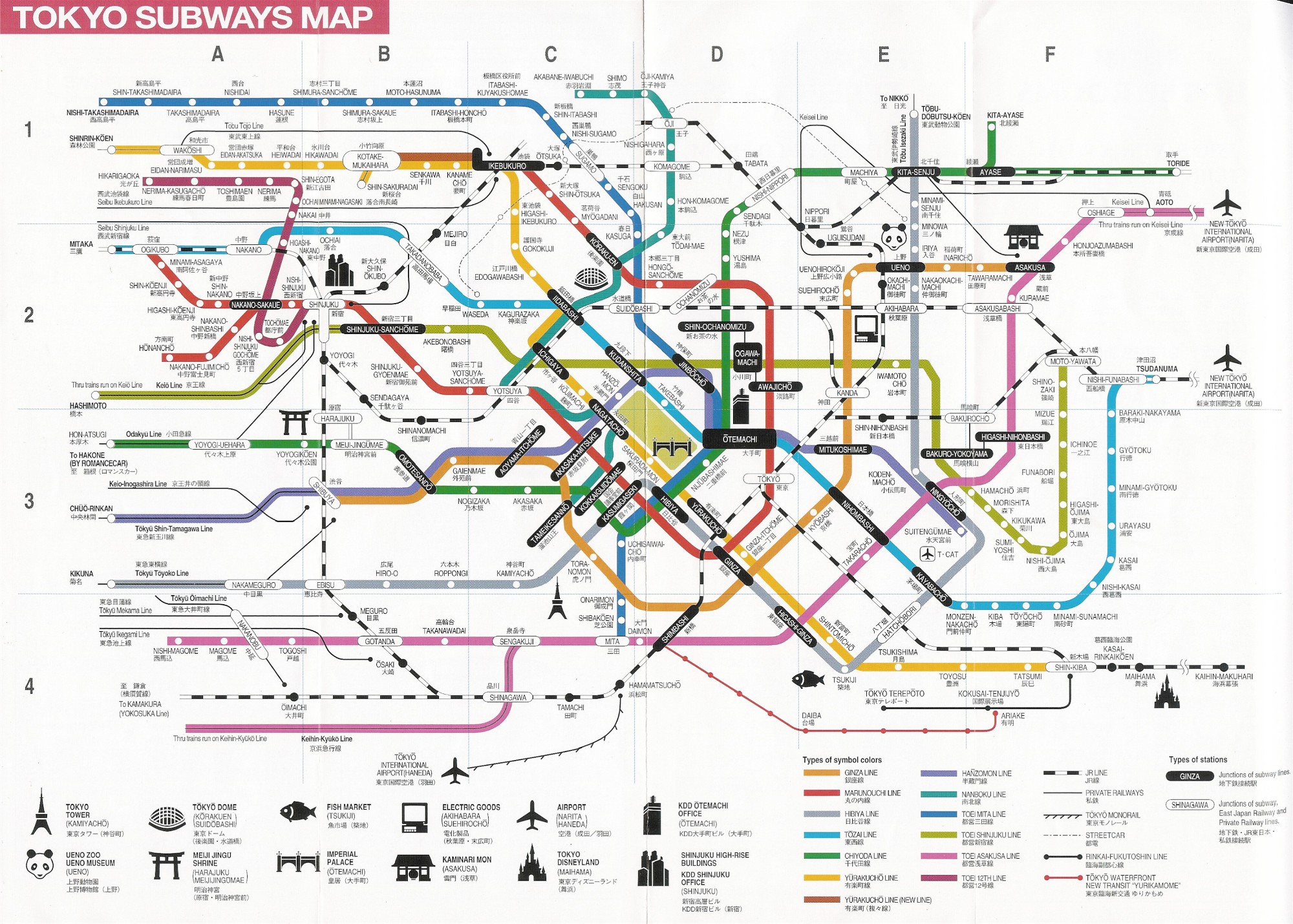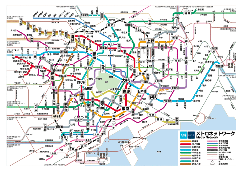 A rede está dividada em duas: a metropolitano de Tóquio e o Toei; funcionam autonomamente uma da outra, e mesmo o título de transporte é diferente. O metro tem 13 linhas com um comprimento total de 286,2 km, fazendo dele o terceiro maior do mundo, a seguir a Nova Iorque e Londres. O Metrô de São Paulo possui hoje 74,3 quilômetros de extensão.