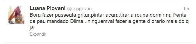 Numa de suas últimas postagens, Luana, torcedora são-paulina, não se conteve na manhã seguinte à eliminação do Corinthians na Taça Libertadores. A atriz foi ao Twitter fazer a tradicional provocação ao rival.