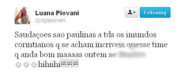 – Saudações são-paulinas a todos os imundos corintianos q se acham incríiveis que esse time que anda bom maaaas ontem se f. hihiihi – escreveu ela.
