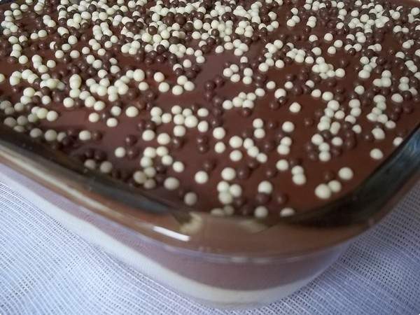 Colocar no fundo de um refratário ou taças as bananas carameladas,despejar o creme,cobrir com a ganache e decorar com os confeitos de chocolate.