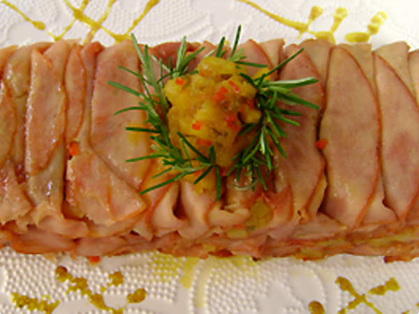 1º – Numa panela em fogo baixo derreta 1 colher (sopa) de manteiga e doure a cebola roxa picada, 1 dente de alho picado, a pimenta vermelha picada e 1 colher (chá) de gengibre ralado. Acrescente o curry em pó e suco de 1 limão grande. Junte o pimentão vermelho picado, o pimentão verde picado, as maçãs sem casca em cubinhos, 1 abacaxi sem casca em cubinhos, uvas-passas brancas e açúcar. Misture muito bem e continue cozinhando com a panela tampada (em fogo baixo) por uns 25 minutos, até que todo o líquido tenha evaporado. Retire do fogo e deixe esfriar.2º – Faça a montagem da seguinte forma: Pegue cada fatia de tender, coloque um pouco de chutney de abacaxi no centro e enrole como um canudinho. Faça isso com todas as fatias do tender e vá transferindo os canudinhos para uma fôrma de bolo inglês forrada com papel alumínio, preenchendo toda a fôrma. Quando terminar o último canudinho, coloque 20 g de manteiga cortada em cubinhos por cima e leve ao forno pré-aquecido a 180º C por 20 minutos. Desenforme no prato de serviço e sirva quente ou frio.