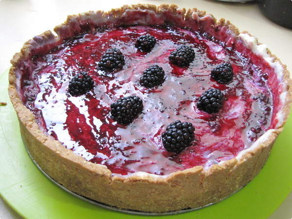 - Coloque as amoras e o açúcar numa panelinha e leve ao fogo, mexa até ficar cremosinho, virar uma geleinha. Espere esfriar e finalize colocando sobre o creme de amora. Decore com algumas amoras, leve a geladeira uns 15 minutos, retire o aro da fôrma e pode servir.