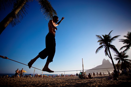 Trickline: Fita ancorada sobre dois pontos fixos, onde a fita fica em média a 1,5 m do chão para que o praticante realize manobras de alto grau de dificuldade.